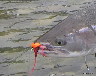 I swung and slowed my fly, applying steelhead tactics to my swing. Chris swung his fly fast through the current and picked up a jumping beauty behind me. With a squeal, laugh and curse, I made my way upstream to try again… downstream mend and all.