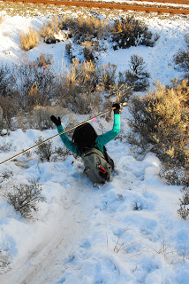 Turning to him, I pointed my iced guides up and together we laughed at our misery.